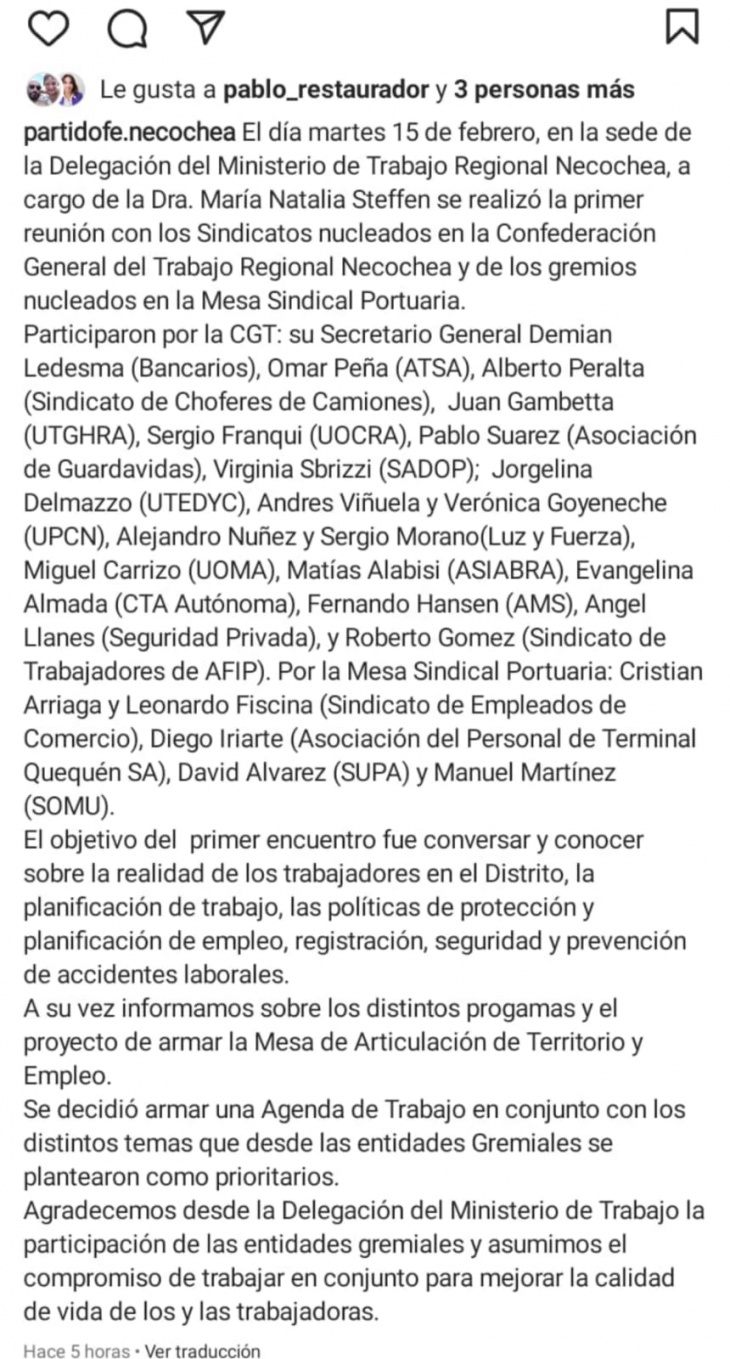 "Fuimos convocados mediante nota formal por la Sra. Steffen, quien fuera designada recientemente a cargo de la Regional Necochea del Ministerio de Trabajo y no por el Partido Fe ni ningún otro espacio político partidario. Concurrimos a la reunión el día jueves 16 de manera orgánica, nos reunimos en el ámbito del Ministerio con el objetivo de analizar la situación laboral de los miles de trabajadores que representamos y plantear nuestras preocupaciones, así como escuchamos acerca de los objetivos de la nueva gestión a cargo de la Delegación de Trabajo para la Región" mencionan en el comunicado que lleva la firma del Consejo Directivo CGT Regional Necochea.