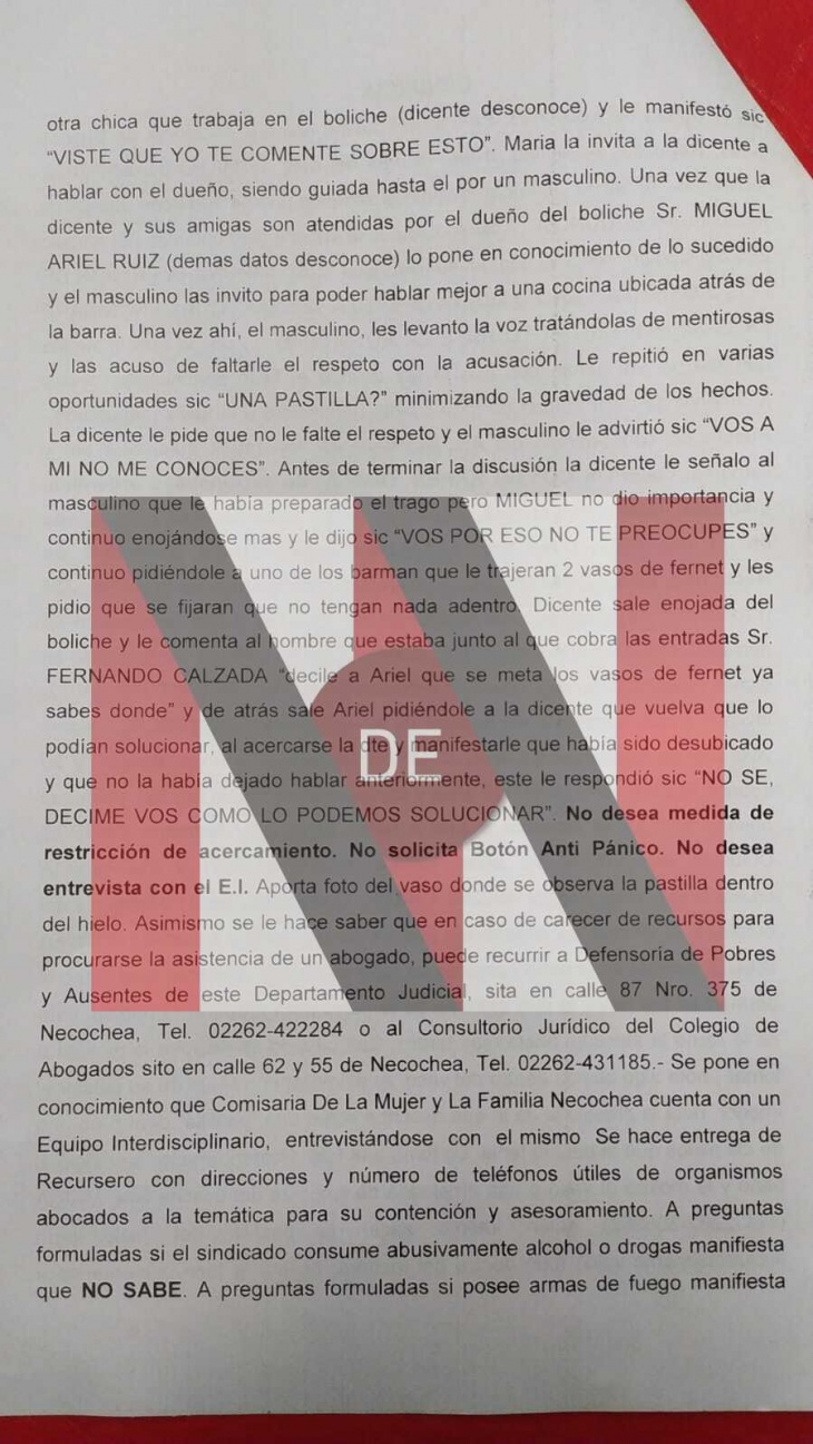 Además de la denuncia, en su Facebook personal elevó el relato donde expresaba todo lo sucedido y, pasados unos díás, asegura que en mensajes privados y en comentarios diferentes personas expresaron que vivieron situaciones similares en las que en dicho boliche: "bebieron uno o dos tragos y comenzaron a sentirse muy mal. (vómitos y demás)".