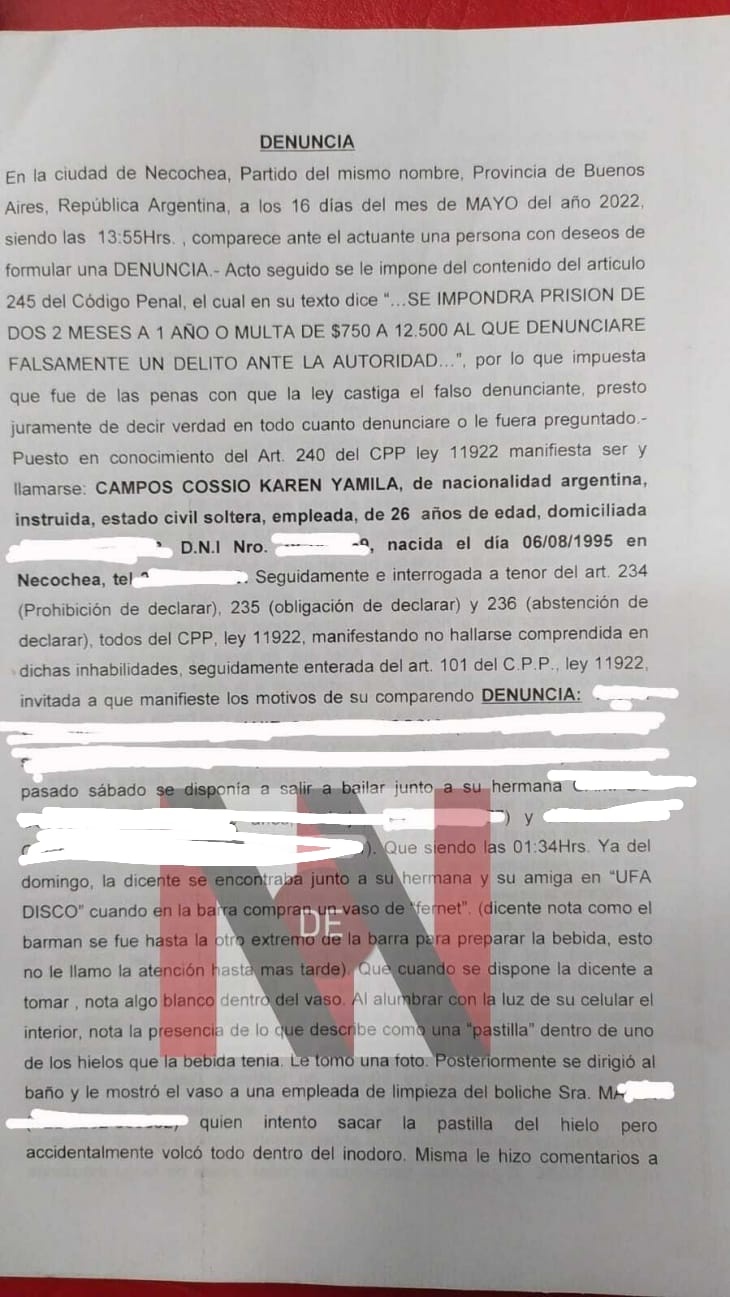 Karen Yamila Campos Cossio fue el domingo a la noche a UFA, el boliche de calles 85 entre 6 y 8. Según denunció en la policía, luego mediante un escrito en redes sociales y finalmente en comunicación con NdeN, que cuando pidió un trago de Fernet en la barra del boliche, descubrió que adentro del hielo, en el vaso, había una pastilla blanca.