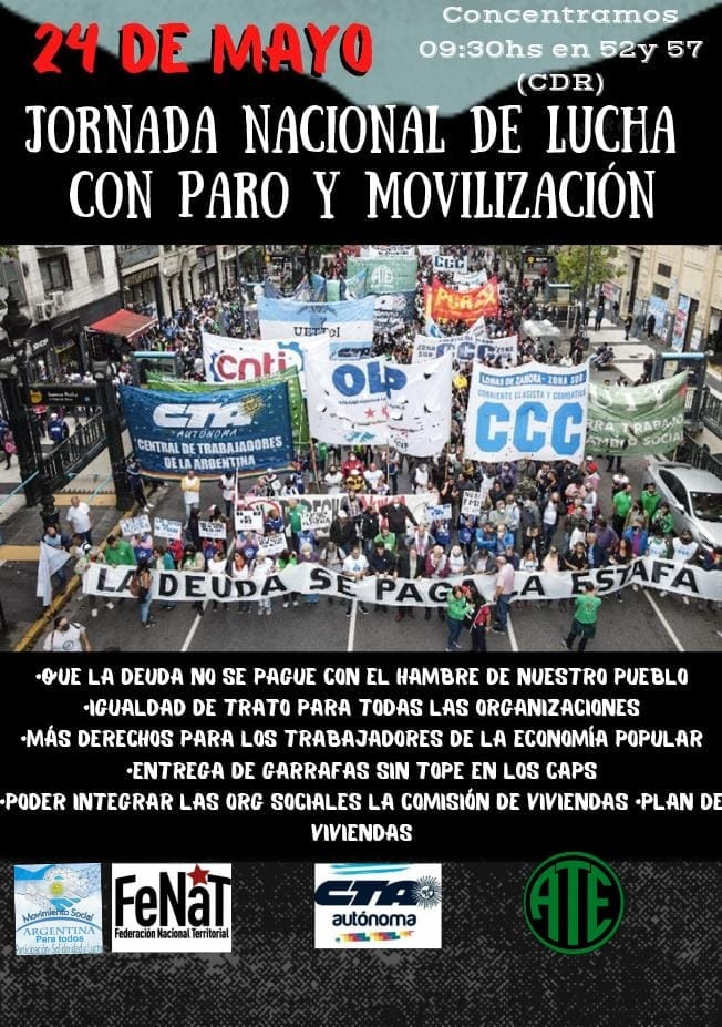 Como se puede ver en el flyer adjunto a continuación, el paro está centrado en Que "la deuda no se pague con el hambre de nuestro pueblo" y además incluyen otras reivindicaciones como : "igualdad de trato para las organizaciones, más derechos para los trabajadores del a economía popular"