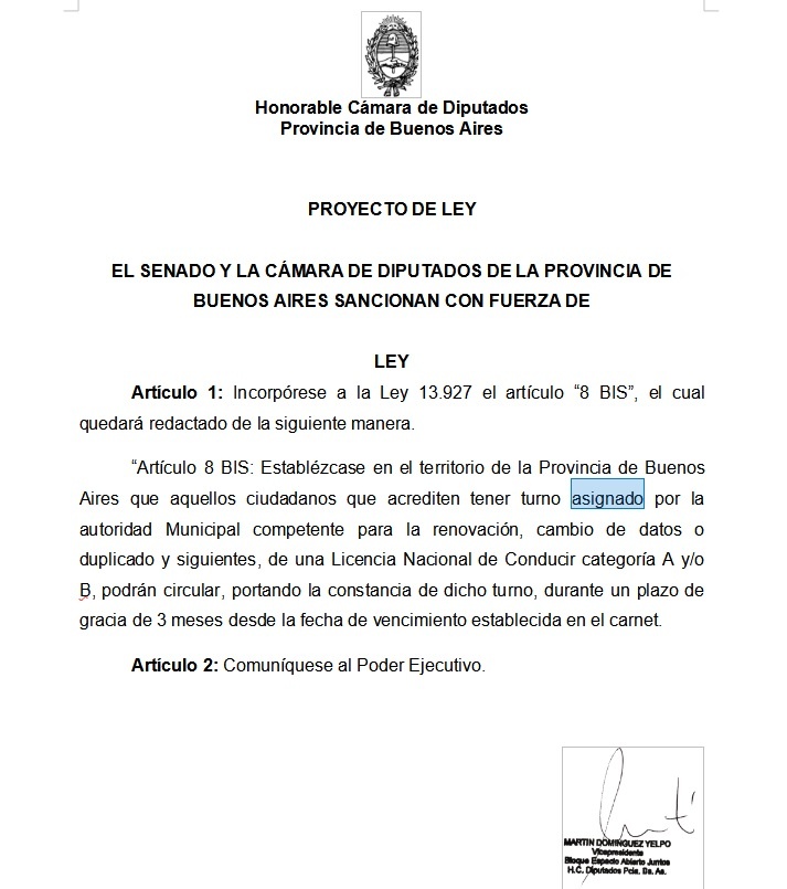De esta manera, el proyecto que cuenta con el apoyo del también integrante del bloque Espacio Abieto Juntos Walter Carusso, busca incorporar el Artículo 8 bis a la Ley 13.927 el cual quedaría redactado de la siguiente manera: “Artículo 8 BIS: Establézcase en el territorio de la Provincia de Buenos Aires que aquellos ciudadanos que acrediten tener turno asignado por la autoridad Municipal competente para la renovación, cambio de datos o duplicado y siguientes, de una Licencia Nacional de Conducir categoría A y/o B, podrán circular, portando la constancia de dicho turno, durante un plazo de gracia de 3 meses desde la fecha de vencimiento establecida en el carnet”.