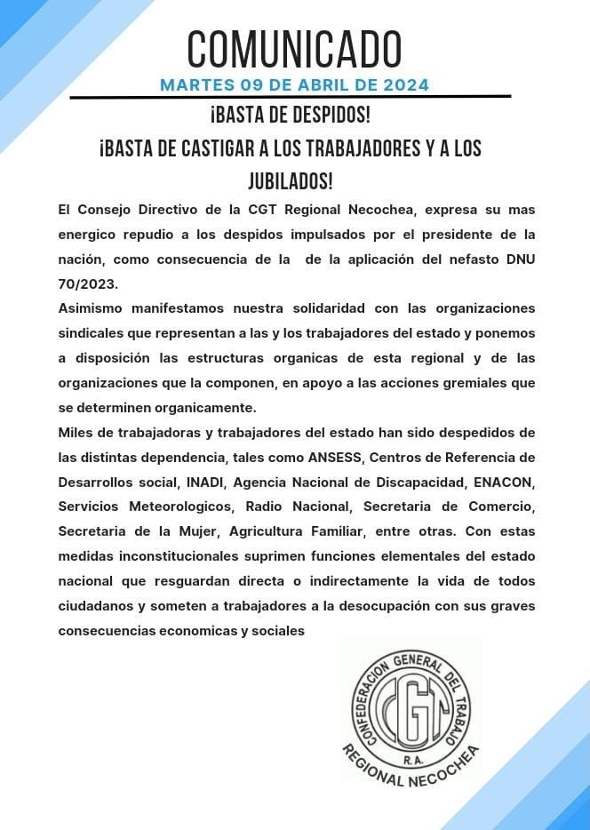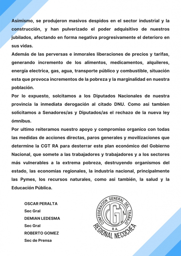 En este contexto, la CGT Regional Necochea solicita a los Diputados Nacionales de la provincia la derogación inmediata del mencionado DNU, y rechaza la nueva ley ómnibus. Asimismo, reitera su apoyo y compromiso con todas las medidas de acción directa, paros generales y movilizaciones determinadas por la CGT a nivel nacional para poner fin a este plan económico del Gobierno Nacional, que afecta a los trabajadores, los sectores vulnerables y diversos aspectos de la vida nacional, incluyendo organismos estatales, economías regionales, industria nacional, recursos naturales, salud y educación pública.