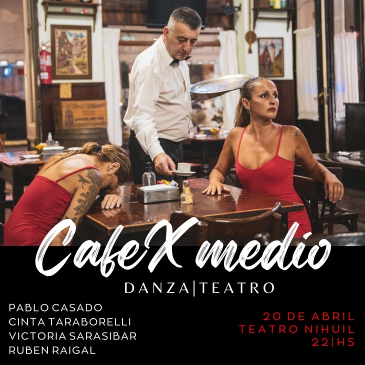 “Café x medio” es una obra de cuerpo, tango y desamor, con las actuaciones de Pablo Casado, Cintia Taraborelli, Victoria Sarasibar y Rubén Raigal. En técnica, estará trabajando Jorge Romero.