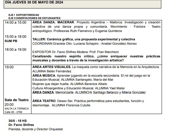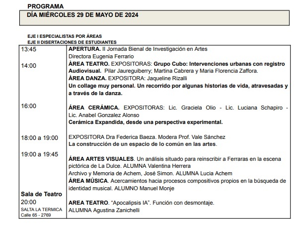 Además, se compartirán investigaciones finalizadas y en desarrollo que darán cuenta del estado actual de la actividad de la disciplina en nuestra región. Estará dirigida a docentes, estudiantes y egresados de las carreras de arte de todos los lenguajes artísticos y al público en general.