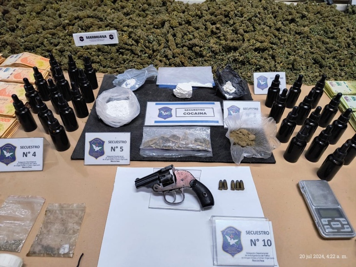 En la vivienda allanada se encontraron seis kilogramos de flores de marihuana, además de semillas y aceite de cannabis. También se incautó Clorhidrato de cocaína, dos balanzas de precisión, equipos para cultivo indoor, sustancias de estiramiento y una suma superior a los ocho millones de pesos en efectivo. El hallazgo de un revolver calibre 32, junto con sus municiones, llevó a la aprehensión de un hombre mayor de edad que residía en el lugar.