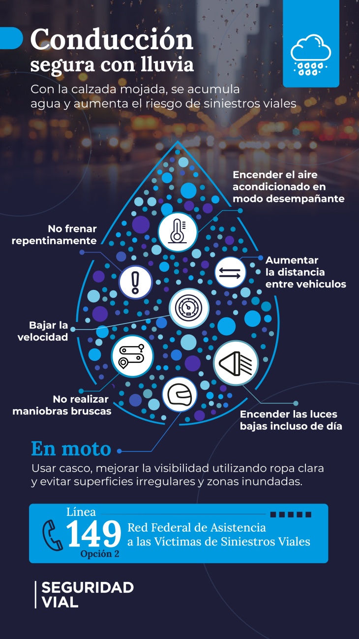 Para los motociclistas, la ANSV recomienda usar siempre el casco, optar por ropa clara para mejorar la visibilidad, y evitar superficies irregulares y zonas inundadas que pueden resultar peligrosas.
