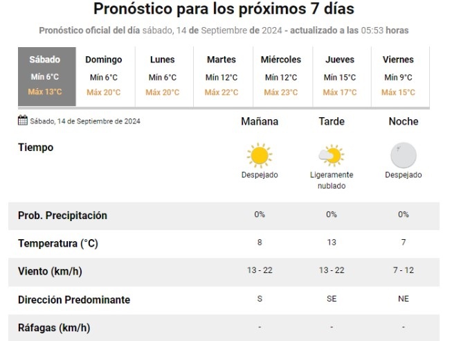 Sábado 14 de Septiembre: La jornada del sábado comenzará con temperaturas frescas, con una mínima de 6 grados y una máxima de 13 grados. La mañana se destacará por un cielo despejado y una temperatura de aproximadamente 8 grados, acompañada de vientos del sur que alcanzarán los 22 km/h. A medida que avance el día, el cielo se tornará ligeramente nublado, sin cambios significativos en la temperatura y con el viento rotando al sureste. Por la noche, se espera que el cielo permanezca despejado, con una temperatura que descenderá a 7 grados y vientos del noreste a 12 km/h. La humedad será del 84% y la presión atmosférica de 1020 hectopascales.