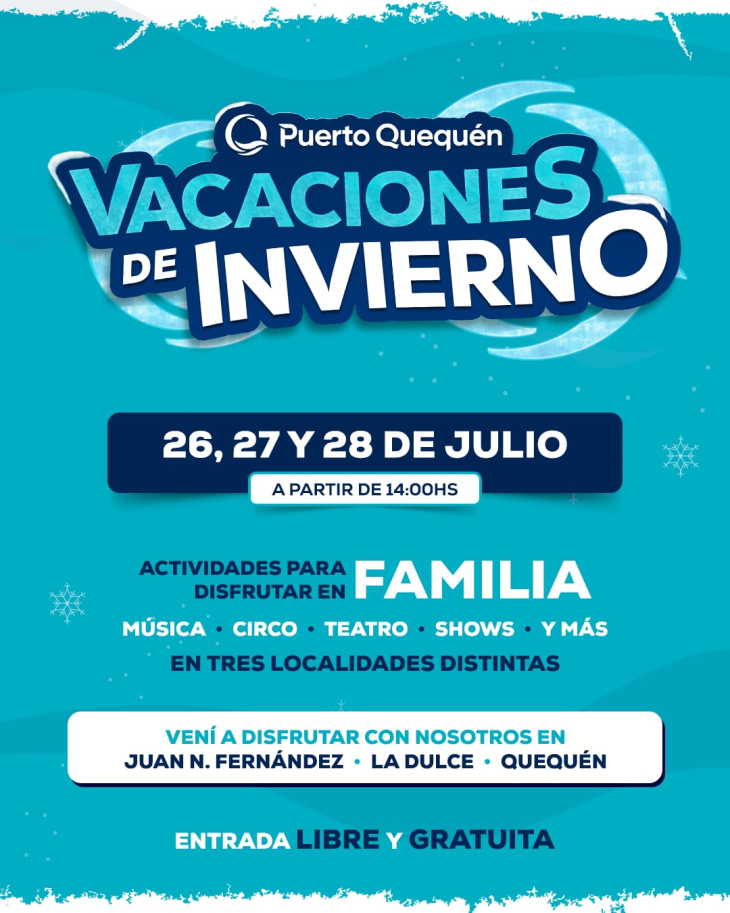 Los días sábado 26, domingo 27 y lunes 28 de julio, desde las 14:00 hs, se realizarán jornadas culturales en Juan N. Fernández, La Dulce y Quequén, con una programación pensada para toda la familia. La iniciativa forma parte de una nueva etapa del programa educativo “El Puerto va a la escuela”, impulsado por la presidenta del ente portuario, Lic. Jimena López.