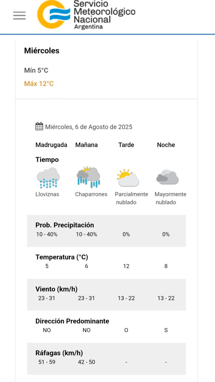 Mañana: chaparrones aislados, leve aumento de temperatura a 6°C, viento sostenido del noroeste con ráfagas de hasta 50 km/h.