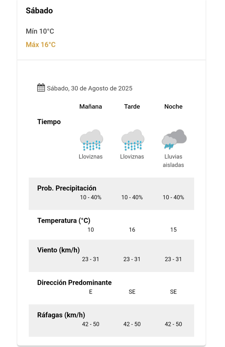 Durante la mañana y la tarde se esperan lloviznas intermitentes, con una probabilidad de precipitaciones que oscila entre el 10% y el 40%. Por la noche, las condiciones se mantienen similares, aunque podrían registrarse lluvias aisladas en algunos sectores.