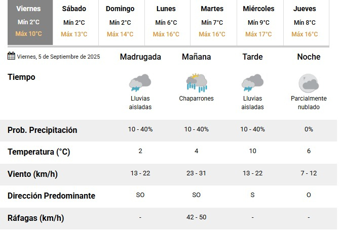 Durante la mañana, la inestabilidad continuará con chaparrones dispersos, probabilidad de lluvia de 10% a 40% y una temperatura de 4°C, aunque el viento se intensificará con ráfagas de 42 a 50 km/h provenientes del sudoeste, generando sensación térmica aún más baja.