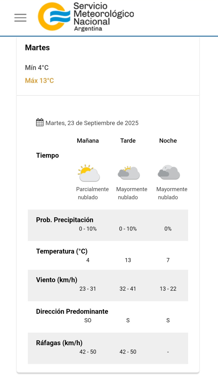 Tarde: el cielo continuará mayormente nublado y la temperatura alcanzará una máxima de 13°C. El viento soplará desde el sur con intensidades entre 32 y 41 km/h, acompañado por ráfagas que podrían superar los 50 km/h.