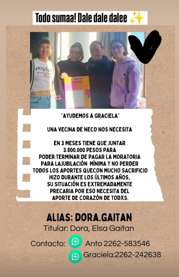 La iniciativa solidaria nació de Antonela, quien conoce de cerca la vida de Graciela. “Ella ya entregó todo lo que pudo en este último año. Como tiene que hacerlo antes de cumplir los 60, debemos juntar ese monto para que, por única vez en su vida, pueda acceder a la jubilación mínima”, señaló Antonela.