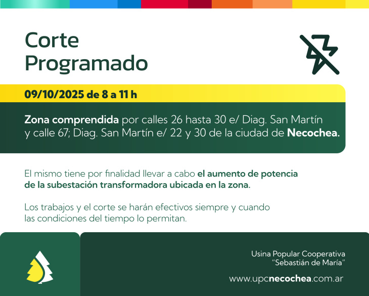 El comunicado oficial aclara que el corte se llevará a cabo únicamente si las condiciones climáticas lo permiten, ya que los trabajos requieren estabilidad para la manipulación de equipos eléctricos. En caso de que el mal tiempo impida su realización, se reprogramará para una nueva fecha que será informada oportunamente.