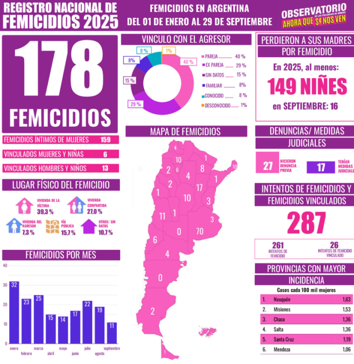 El Observatorio advierte que la falta de políticas públicas efectivas y la difusión de discursos misóginos y negacionistas profundizan la violencia machista, exponiendo a mujeres y disidencias a situaciones extremas de vulnerabilidad. Además, 149 niños y niñas quedaron sin madre como consecuencia de estos crímenes, y 14 de los agresores pertenecían a fuerzas de seguridad.
