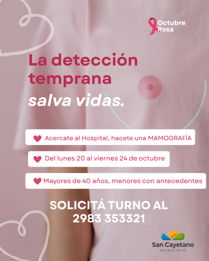 Como parte de esta acción preventiva, desde el lunes 20 hasta el viernes 24 de octubre se realizarán mamografías gratuitas en el Centro de Diagnóstico por Imágenes (CDI) del Hospital Municipal.