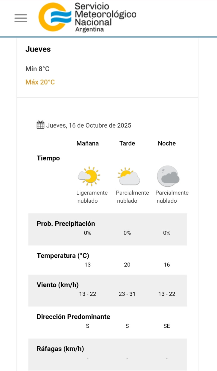 La mañana comenzará fresca, con una mínima de 13°C y vientos del sur entre 13 y 22 km/h.