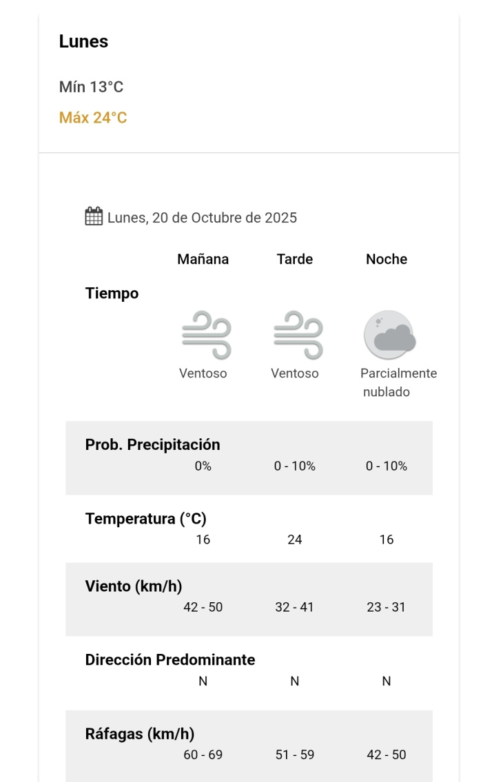 Durante la tarde, el viento continuará aunque con menor intensidad —entre 32 y 41 km/h—, y el cielo se mantendrá ventoso y parcialmente nublado. La temperatura máxima prevista es de 24°C, mientras que hacia la noche descenderá nuevamente a 16°C, sin probabilidad de lluvias.