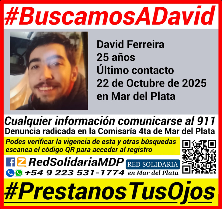 Desde la organización Red Solidaria Mar del Plata informaron que cualquier persona que pueda aportar información sobre el paradero de Ferreira puede comunicarse a los teléfonos 223 531 1774 o 223 6897944, además de realizar el aviso al 911.
