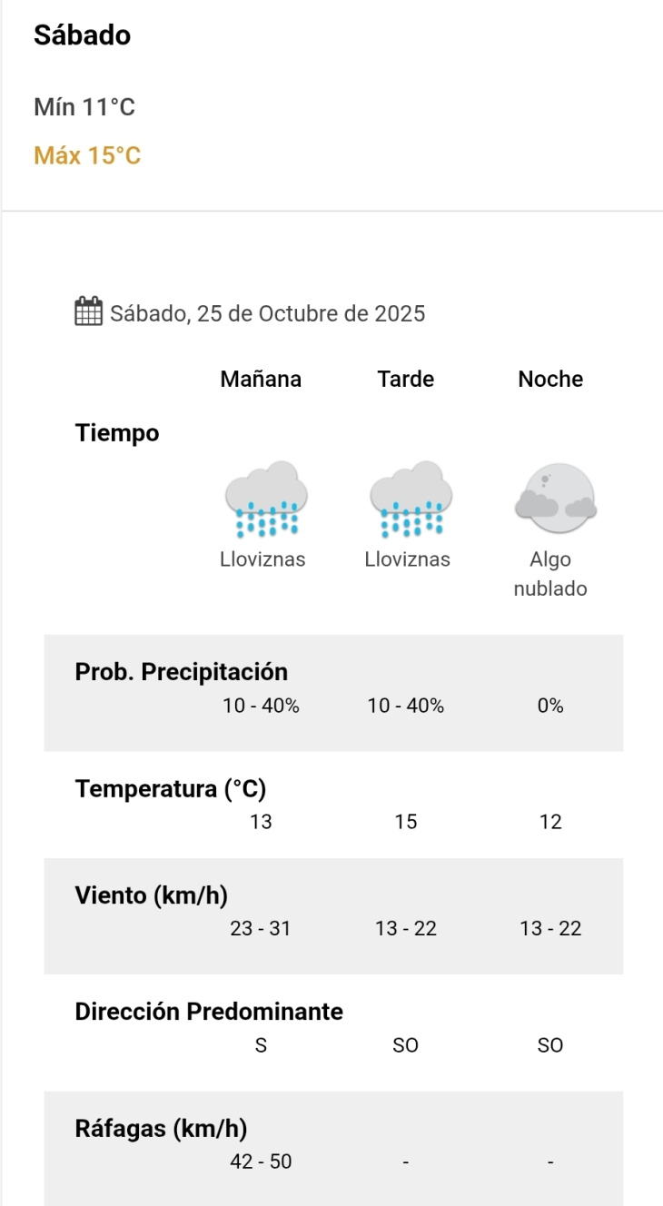 La temperatura máxima alcanzará los 15 °C, mientras que la mínima será de 11 °C, en una jornada con viento predominante del sur y suroeste, que soplará entre 23 y 31 km/h, con ráfagas que podrían llegar a los 50 km/h durante las primeras horas del día.