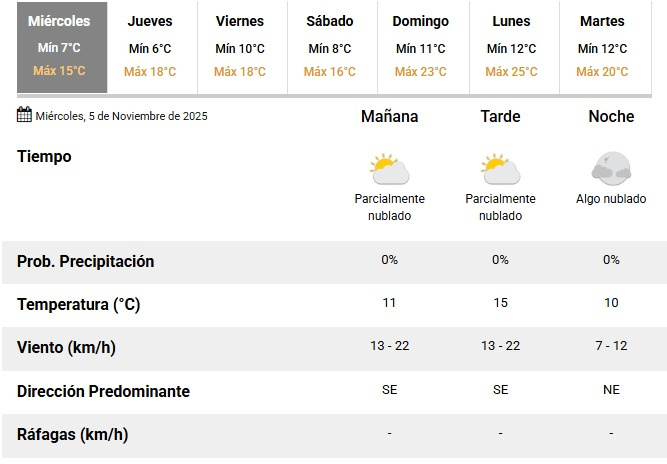Hacia la tarde, se mantendrán las mismas condiciones: cielo parcialmente cubierto, máxima prevista de 15 °C y baja humedad, alrededor del 59 %, lo que anticipa una jornada estable y agradable.