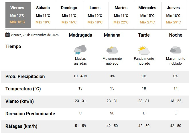 Se prevé una leve mejora con momentos de cielo parcialmente nublado. El viento continuará del este, manteniendo velocidades entre 23 y 31 km/h. La temperatura ascenderá hasta los 18°C, la máxima prevista para la jornada.