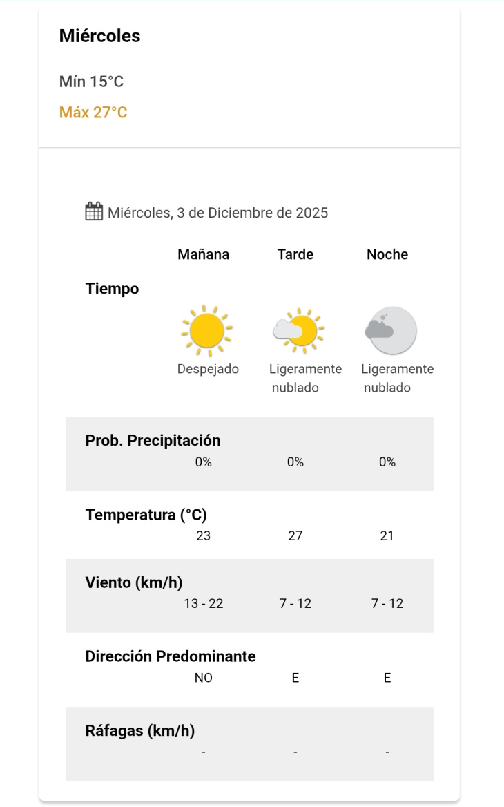La jornada no presenta probabilidades de precipitaciones (0% en todo el día) y los vientos se mantendrán débiles, sin ráfagas significativas.