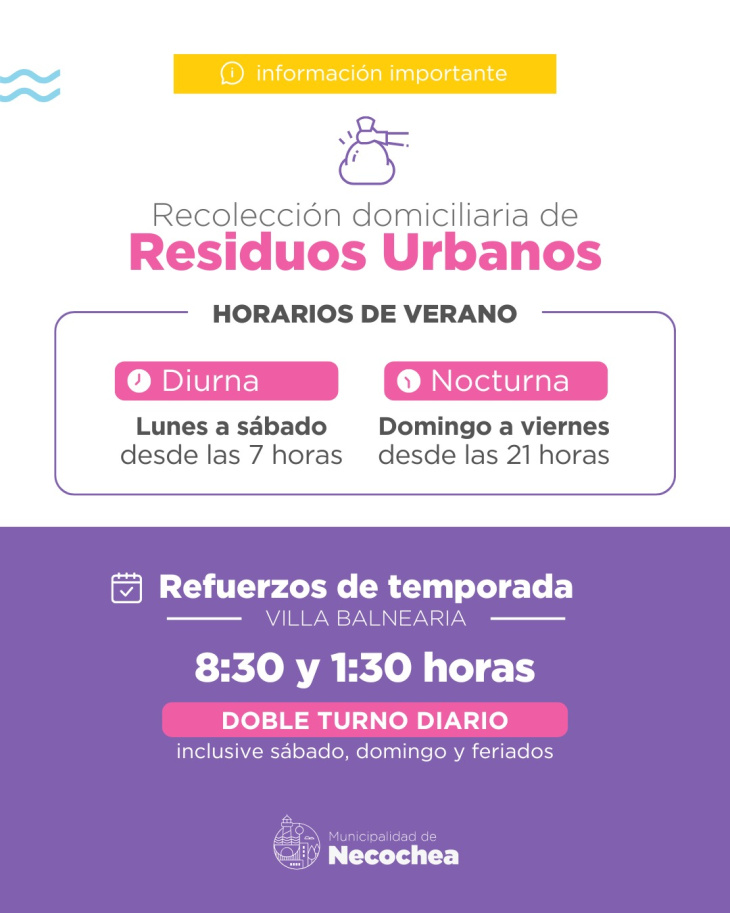 Debido al incremento de residuos propio de la temporada estival, la Villa Balnearia tendrá dos pasadas diarias todos los días, incluidos feriados y domingos: