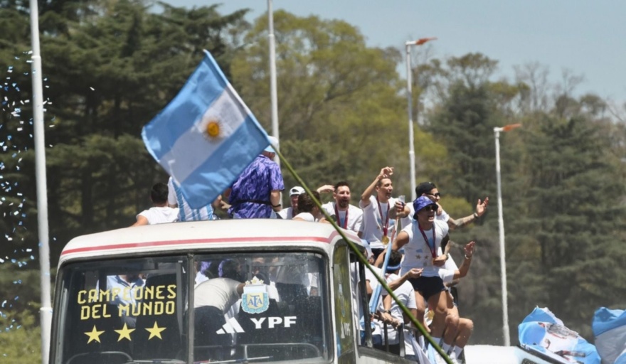 Encabezados por Lionel Messi, Rodrigo De Paul y Enzo Fernández, los campeones del mundo fueron trasladados en el micro descapotable de la empresa Plusmar hasta la escuela de cadetes Pirker de la Policía Federal Argentina, en Villa Lugano, donde abordaron helicópteros policiales y de la Prefectura Naval.