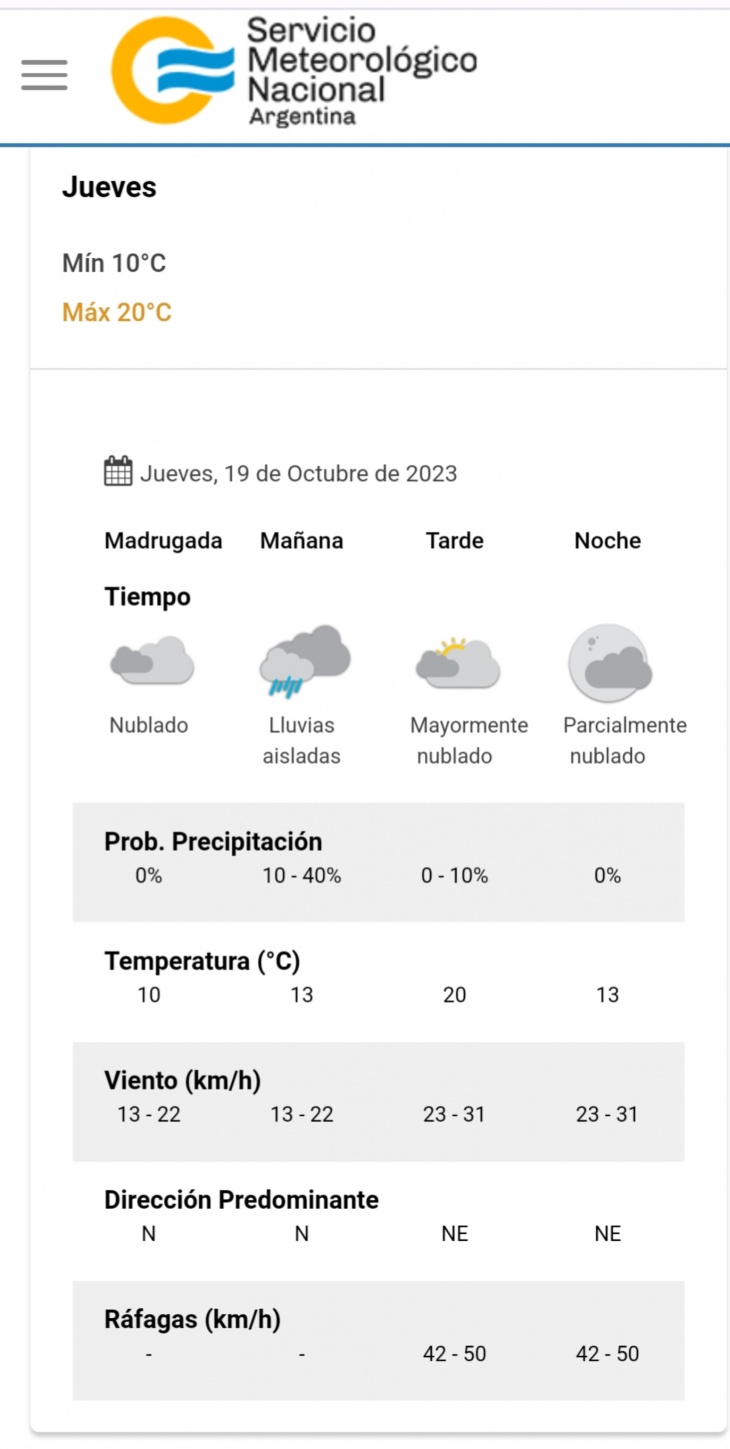 El parte del servicio meteorológico prevé que para después del mediodía el cielo estará mayormente nublado y los vientos del sector noreste tendrán velocidades estimadas entre 23 y 31km/h. La temperatura pronosticada sería de 20 grados.