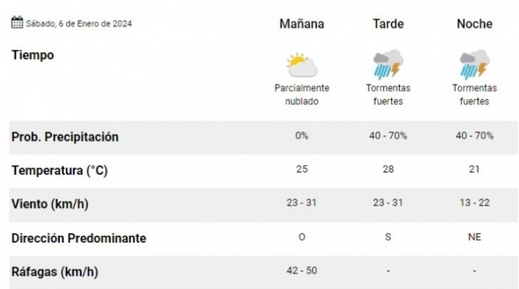 Según el pronóstico, la temperatura mínima será de 17ºC, con tormentas fuertes durante la madrugada. El viento soplará desde el Noreste con una velocidad de 31 kilómetros por hora. En la mañana, se espera una temperatura de 25°C, viento Oeste y cielo parcialmente nublado.