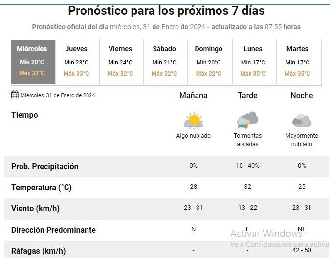 En cuanto al pronóstico extendido, para el domingo se espera un leve alivio en las temperaturas con una mínima de 16 grados Celsius y una máxima de 26 grados Celsius, cielo parcialmente nublado y vientos del este. Sin embargo, el lunes se prevén tormentas aisladas durante todo el día, con vientos del norte y una máxima que podría superar los 33 grados Celsius. Ya para el martes hay anuncio de tormentas aisladas por la mañana y cielo mayormente nublado por la tarde. Vientos leves del norte, rotando al noroeste. Mínima de 17°C, máxima de 35°C.