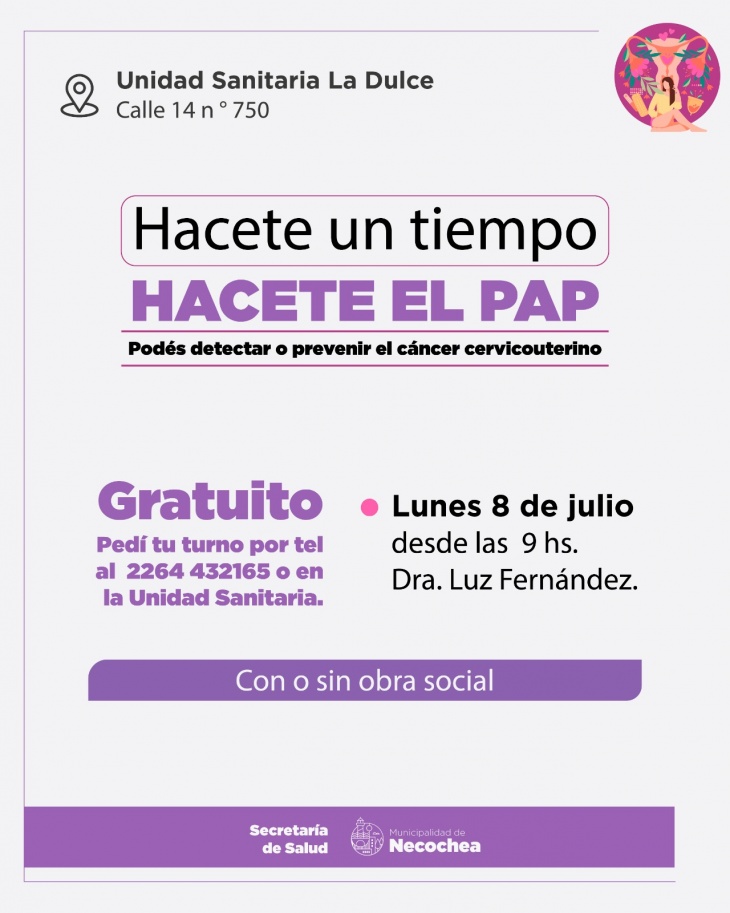 Mujeres residentes en La Dulce, con o sin obra social, están invitadas a participar en esta jornada preventiva. Aquellas interesadas pueden solicitar un turno llamando al 2264-432165 o acudiendo personalmente a la Unidad Sanitaria mencionada.