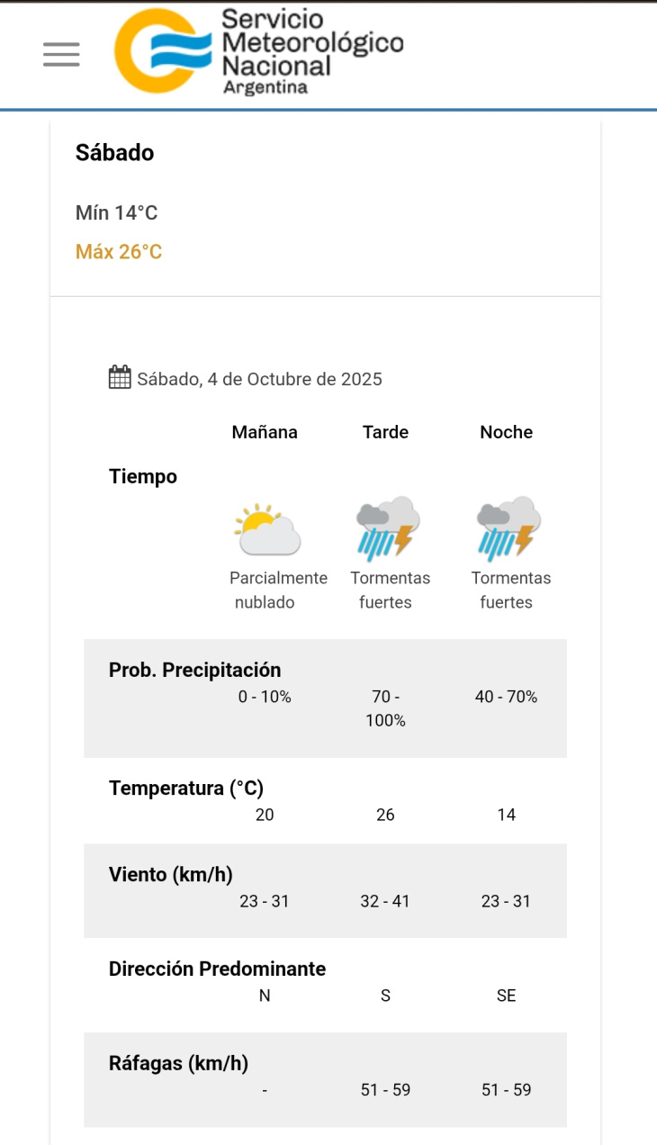Sin embargo, hacia la tarde llegará el cambio: se esperan tormentas fuertes, con probabilidades entre el 70 y 100%, vientos del sector sur que podrían superar los 40 km/h y ráfagas de hasta 59 km/h. La temperatura máxima alcanzará los 26 grados, pero la humedad cercana al 99% hará que el ambiente se sienta pesado.