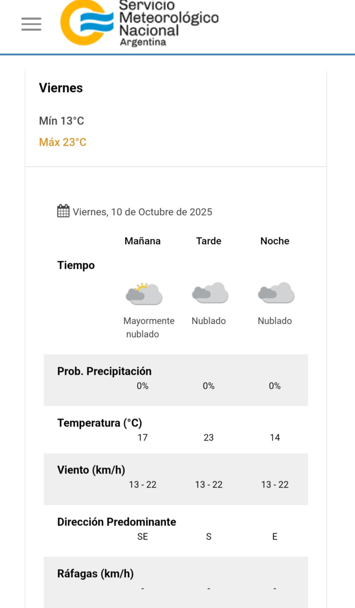 Este viernes 10 de octubre, Necochea y Quequén tendrán un día de cielo mayormente cubierto, aunque sin chances de precipitaciones. La temperatura máxima alcanzará los 23°C, mientras que la mínima será de 13°C, manteniendo un clima templado y agradable pese a la falta de sol.