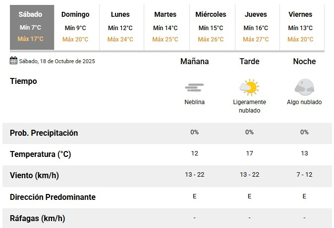 La temperatura mínima está prevista en 7°C, mientras que la máxima alcanzará los 17°C durante la tarde. No se esperan precipitaciones en ningún momento del día, con una probabilidad de lluvia del 0% en las tres franjas horarias.