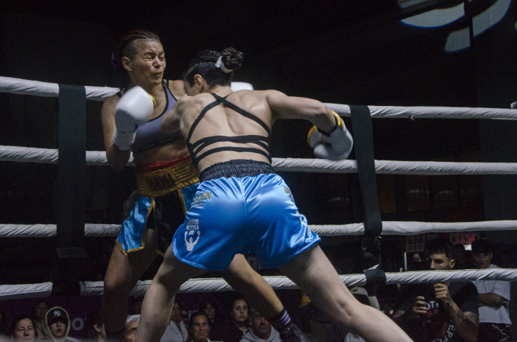 La atención se centró poco después en Araí Leoz, boxeadora profesional nacida en Necochea, quien se enfrentó a Tamara Medina en el séptimo combate pautado a cuatro rounds. La pelea fue breve pero intensa, y culminó con un knockout en el primer round, luego de que Araí impusiera su técnica y experiencia desde el inicio.