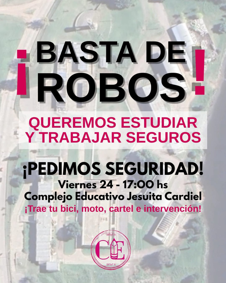 “Como es de público conocimiento, todo el año hemos sufrido hechos delictivos en nuestro complejo Jesuita Cardiel. Desde robos hasta boquetes en el edificio La Ribera. Y en el día de hoy decimos ¡Basta! Queremos estudiar seguros. Invitamos a toda la comunidad educativa a concentrarse para visibilizar los hechos de inseguridad y vandalismo que venimos acarreando desde hace años”.