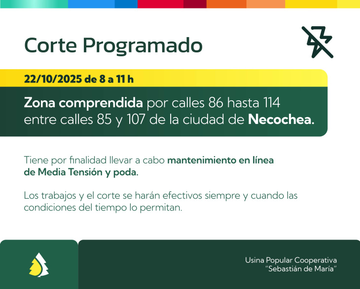 El sector afectado comprende las calles 86 a 114, entre 85 y 107, de la ciudad de Necochea. Desde la cooperativa aclararon que los trabajos se concretarán únicamente si las condiciones del tiempo lo permiten, dado que las tareas en altura requieren seguridad y visibilidad adecuadas.