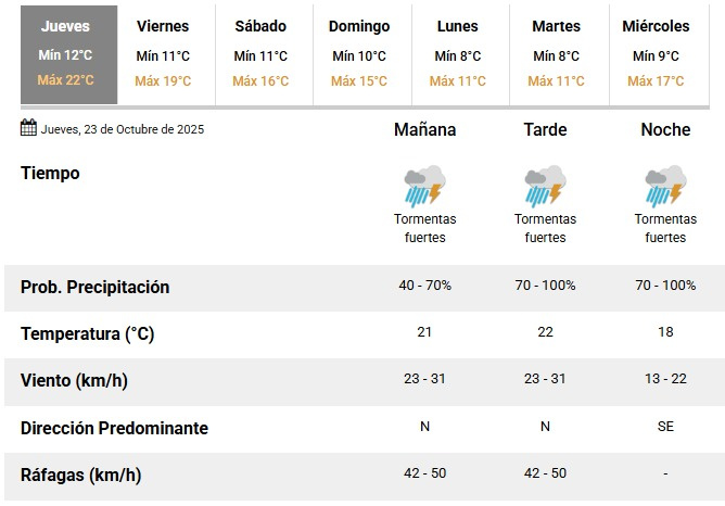 Las temperaturas máximas y mínimas previstas para este jueves son de 22 y 12 grados, respectivamente, con niveles de humedad cercanos al 99% y presión atmosférica de 1013 hPa. El viento soplará del norte durante la mañana y tarde, cambiando al sudeste por la noche, con velocidades estimadas entre 23 y 31 km/h, y ráfagas superiores a los 40 km/h.