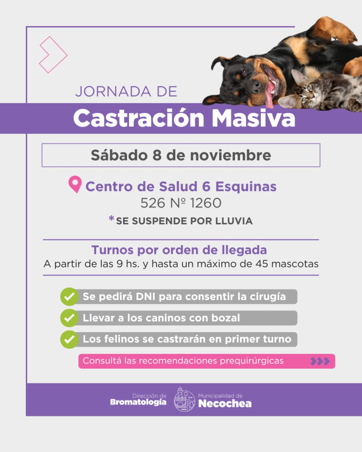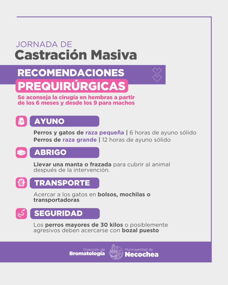 Desde la Dirección de Bromatología se brindan recomendaciones pre quirúrgicas: la cirugía puede realizarse a partir de los 6 meses en hembras y desde los 9 meses en machos. Respecto al ayuno, los perros y gatos de raza pequeña deben estar 6 horas sin alimento sólido, y los de raza grande, 12 horas.