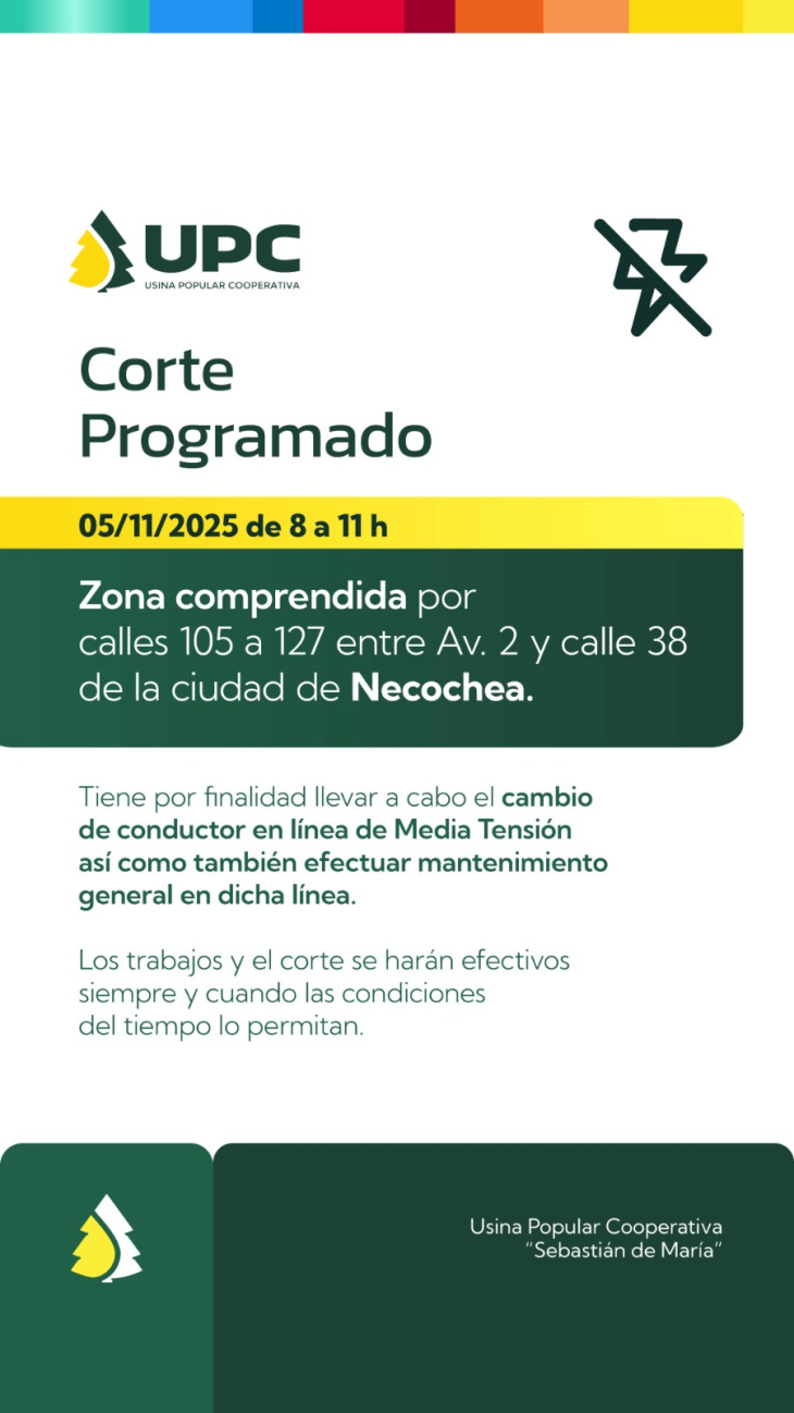 El primer corte será el miércoles 5 de noviembre, de 8 a 11 horas, en la zona comprendida por calle 105 a 127, entre avenida 2 y calle 38, en Necochea. Durante este período se realizará el cambio de conductor en la línea de media tensión y se efectuarán tareas de mantenimiento general, siempre que las condiciones climáticas lo permitan.