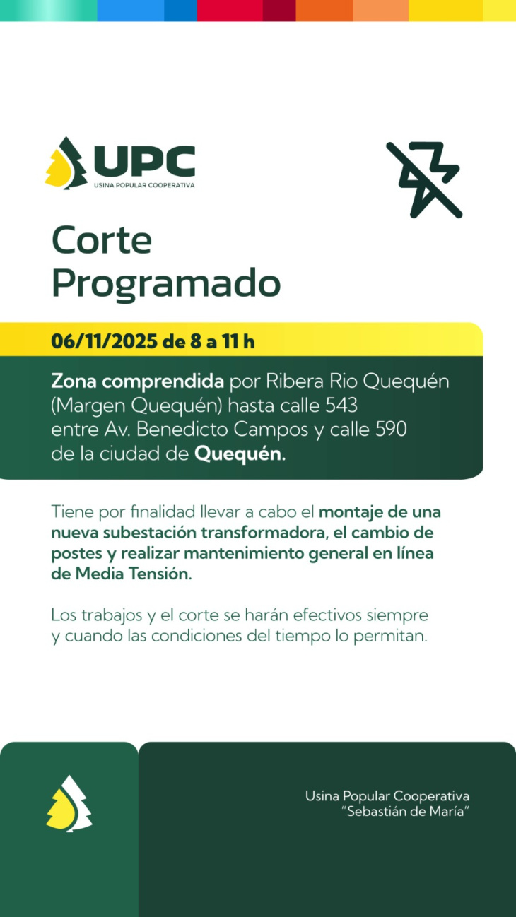 El segundo corte está programado para el jueves 6 de noviembre, también de 8 a 11 horas, en Quequén, abarcando la zona de la Ribera del río Quequén, margen Quequén hasta calle 543, entre avenida Benedicto Campos y calle 590. Este corte se realiza para el montaje de una nueva subestación transformadora, reemplazo de postes y mantenimiento general de la línea de media tensión, sujeto a las condiciones del tiempo.