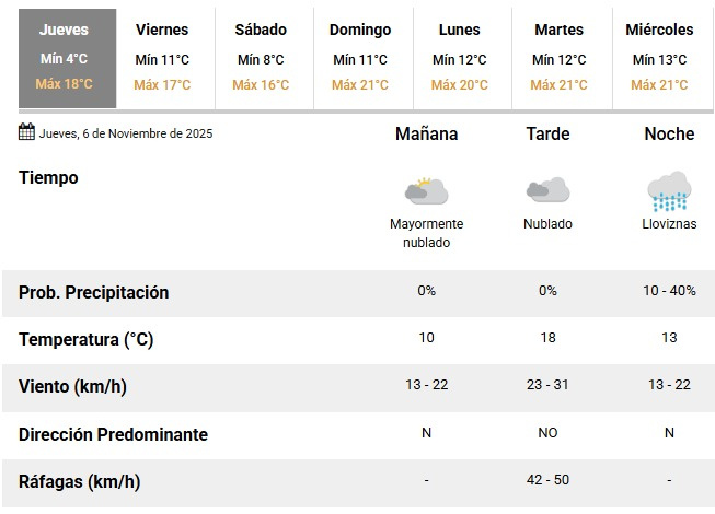 Por la tarde, la nubosidad se mantendrá densa y la temperatura máxima ascenderá hasta los 18 °C. Los vientos rotarán al noroeste, alcanzando entre 23 y 31 km/h, con ráfagas de hasta 50 km/h, lo que podría generar sensaciones térmicas variables en zonas expuestas y costeras.