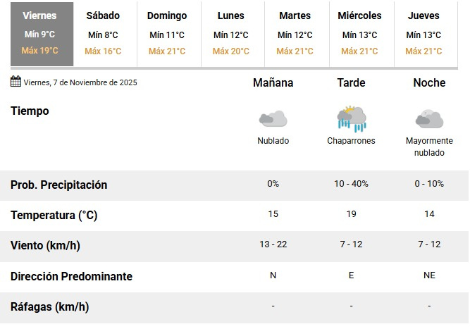 Durante la mañana, el cielo estará nublado, con una temperatura mínima cercana a los 15 °C y vientos del norte entre 13 y 22 kilómetros por hora.