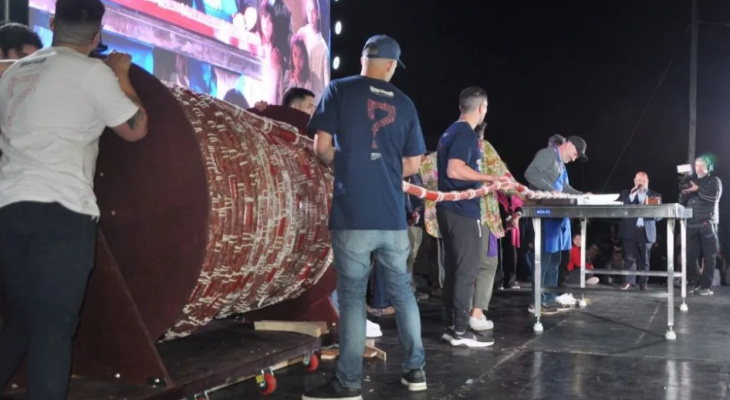 Según informó El Eco de Tandil, el evento reunió a productores locales, turistas y cientos de vecinos, en una jornada que combinó gastronomía, música y tradición. A las 19.45, el enorme salame irrumpió en escena desde un camión de la empresa Cagnoli, transportado en un carrete que contenía cerca de 2.000 kilos del embutido, elaborado íntegramente por chacineros de la región.
