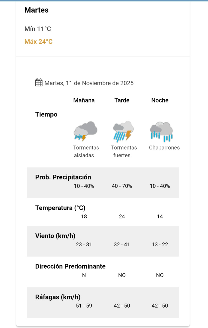 Durante la mañana se prevén tormentas aisladas, mientras que por la tarde podrían registrarse tormentas fuertes, con una probabilidad de precipitación que oscilará entre el 40 y el 70%. Hacia la noche, se esperan chaparrones dispersos.