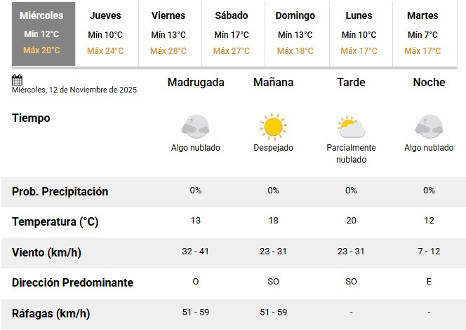 Durante la madrugada, el cielo estará algo nublado, con una temperatura mínima de 13 °C, vientos del oeste entre 32 y 41 km/h y ráfagas de 51 a 59 km/h. La humedad relativa alcanzará el 96 %, mientras que la presión será de 1006,6 hPa.
