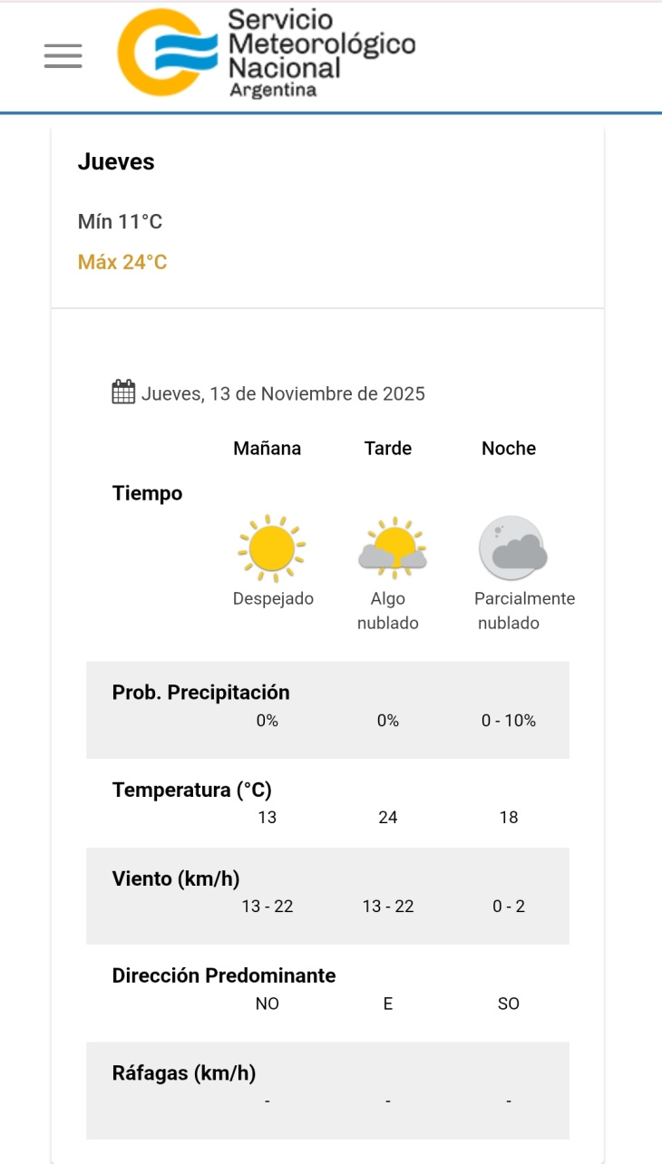 🔹 Pronóstico ideal para actividades al aire libre, con condiciones estables durante toda la jornada.