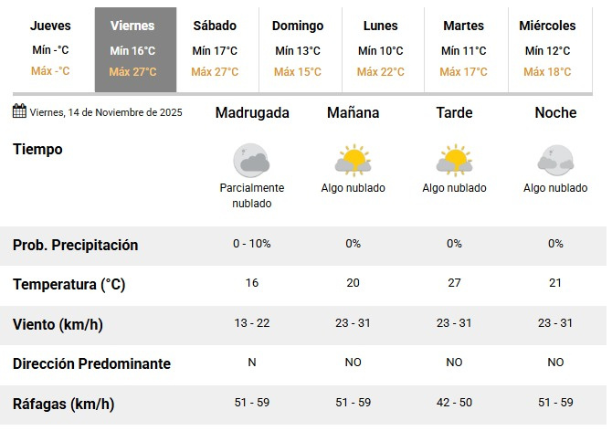 Durante la madrugada el cielo estará parcialmente nublado, con 16°C y vientos del norte entre 13 y 22 km/h, acompañados por ráfagas de 51 a 59 km/h. Hacia la mañana se prevé un ascenso de temperatura hasta los 20°C, bajo cielo algo nublado y con la rotación del viento hacia el noroeste, manteniéndose entre 23 y 31 km/h, con ráfagas fuertes en el mismo rango.